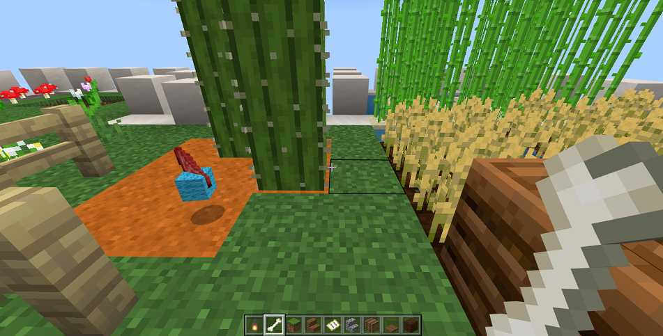 クリエイティブ・モード サボテンが危険だなんて聞いてないよ! 20220921 0 CM 「シェリーロワール城」の屋上には「空中庭園」があり、様々な植物を実験的に栽培しているのですが… (サバイバル・モードでまだ出会えていない植物も育てています。) ここで育てて初めて「サボテンが羊を殺す」ということを知りました…。 空中庭園では、羊やウサギなどの動物も放し飼いにしているのですが… 何気なくサボテンに歩み寄っていった羊が、次の瞬間「ウールと羊肉」に…! 危ないので部分的に柵で囲ってみましたが、全てを囲ってしまうと近づけなくなるので、一部は開けたままにしてあります。 そこに、またしても羊が……! 「ぅわあぁぁーっ!待て待て!」と止めるヒマもなく、この羊もウールと羊肉に…