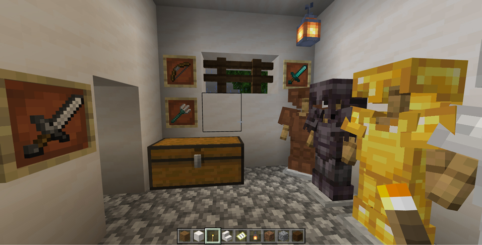 クリエイティブ・モード お城の1Fには武器保管庫もあります 20220928 0 CM 「シェリーロワール城」の1Fには「武器保管庫」もあります。 「謁見の間」の手前にある2つの小部屋のうち1つ、厨房の向かいの部屋です。 防具立てに防具一式をかけたり、額縁に各種武器を収納して、それっぽくしています。