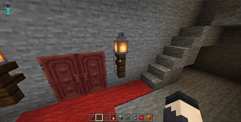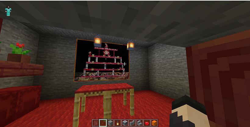 クリエイティブ・モード 帝国宮殿の控室その1 20230910 0 CM ガルトブルグ帝国の宮殿クリスパレスの、貴人用“控室”です。 フランスの宮殿では、上流の人々が祝宴に招かれる際、「グラン・キャビネ(大付属室)」という、普段は使われていない部屋が開放されていたそうです。 そんなイメージで、玉座のある広間の手前に貴人用の控室的な部屋を用意してみました。 壁をくりぬいた箇所に「たき火」を置いて「暖炉」っぽくしてみたり… 「足場」の上に「カーペット」を置いて「テーブル」っぽくしてあります。 壁には絵画、壁際には花を飾って「客人用」のおもてなし感を出しています。