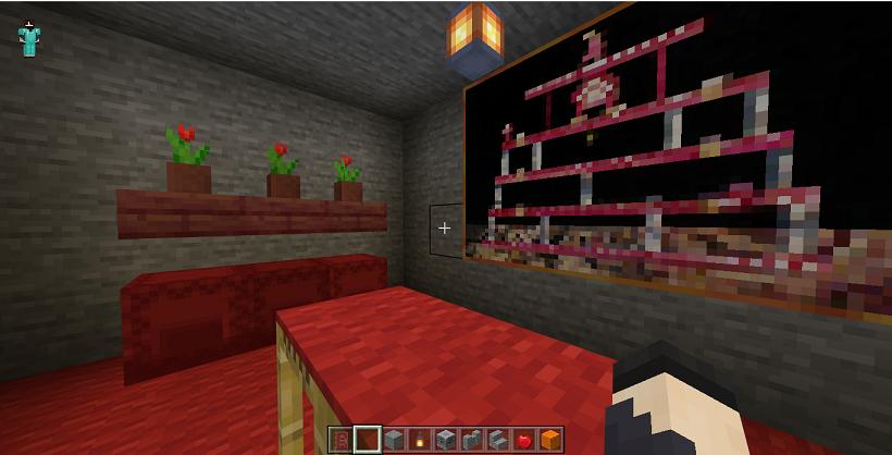 クリエイティブ・モード 帝国宮殿の厨房 20230818 0 CM ガルトブルグ帝国の宮殿クリスパレスの、入ってすぐ右手の部屋は厨房になっています。 国の規模が大きいので、シェリーロワール城の厨房より広々しています。 調理台(という設定の石のブロック)の上には「肉」の入った「額縁」を置き「今、肉を調理しています」という感じに…。 壁際には「燻製器」と「かまど」と「大釜」を並べて置き、上部に排気用のダクトっぽいモノを作ってあります。 正面の窓際では「スイートベリー」を栽培しています。 「採れたてをすぐに調理できる」感があって良いかと…。