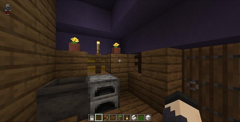 クリエイティブ・モード 城勤めの人々の宿舎(城外その2) 20230311 0 CM 「シェリーロワール城」に勤める人々の「宿舎」というイメージで作った家その2です。 「その1」の赤い屋根の方は単身者用のワンルームタイプ、こちらの青い屋根の方はファミリー向けの一軒家という設定です。 (小説にはそこまで細かな設定は出てきません。というか、宿舎自体が小説に登場しません。) 部屋は2つあり、入ってすぐの部屋には「かまど」や「大釜」を置いて「台所」にしています。 奥の部屋は寝室です。ベッドが2つ並んでいます。 ベッド側から見ると、こんな感じです。家具として「チェスト」と「書見台」が置いてあります。