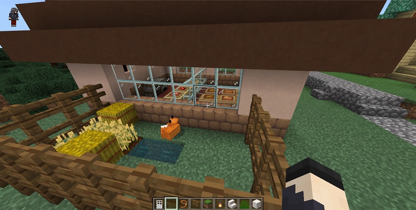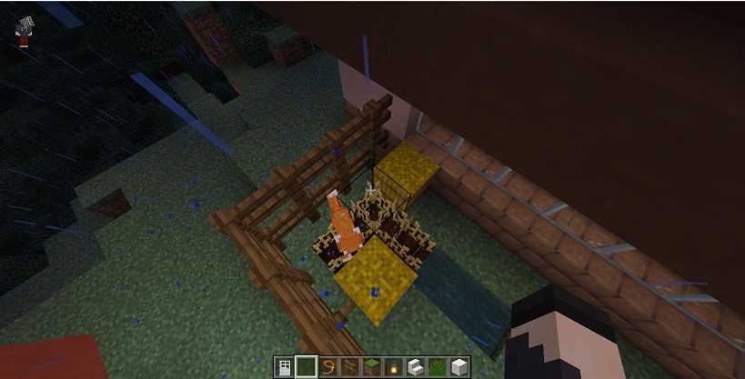 スポーンさせておいた数羽のニワトリが、気づけば1羽もいなくなっていて、代わりにキツネが寝ていました。