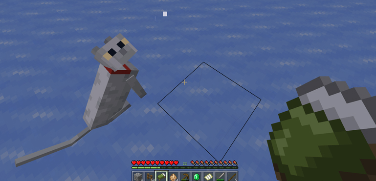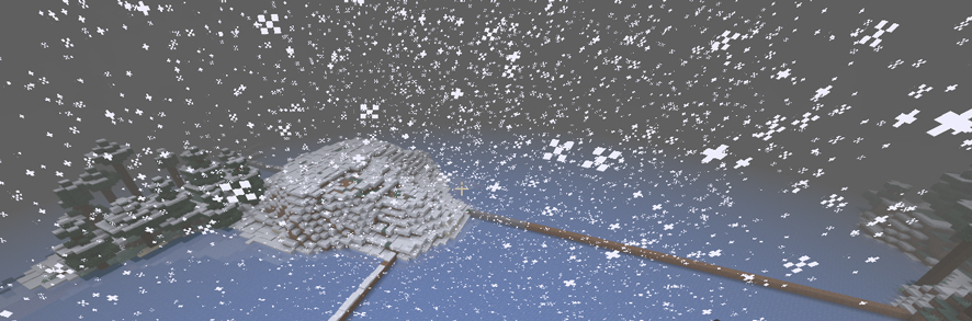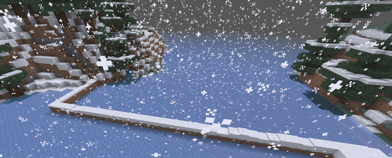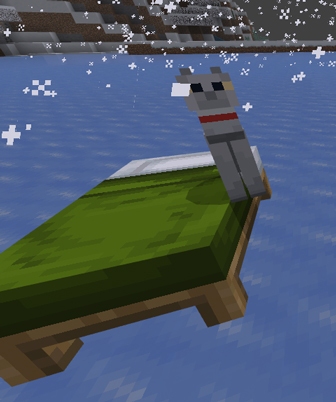 (凍った海の上を移動中、ふと思いつきで手に持っていたベッドを置いてみたところ、ついてきていたネコチャンがスタンバイしてくれました。(マイクラではネコチャンが懐くと一緒のベッドで寝てくれます。))